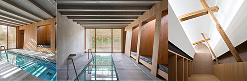 頂面、墻面采用水泥漆,地面采用水泥磚。休息區(qū)域的床采用原木色木飾面,在落地窗使用木格柵。