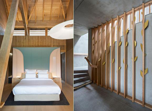 客房頂面保持原建筑頂面斜屋頂,同時在每間客房都保留了陽臺,在陽臺處擺放一套桌椅,愜意地享受陽光,放松身心??头恐写蟛糠植捎迷旧撅椕?,與建筑外觀整體相呼應,在樸實中加入了一些現(xiàn)代元素,在床靠背景處采用了皮質硬包,為空間增加一抹亮色。